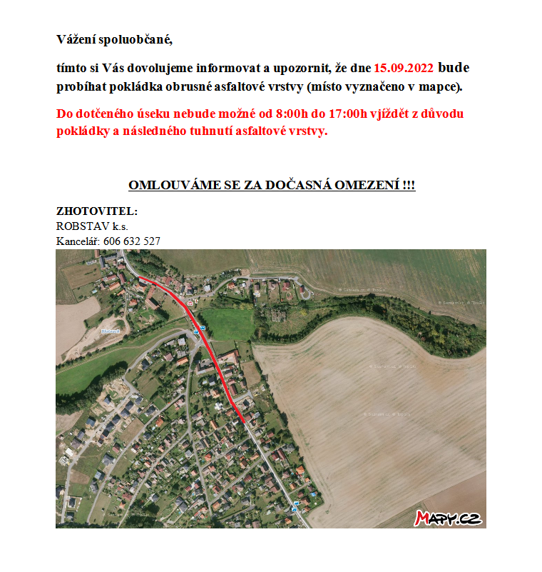 Dne 15.9.2022 nebude možné projet obcí Litohlavy z důvodu asfaltování silnice. Prosíme občany, aby v tento den neparkovali ve vyznačeném úseku (viz foto).