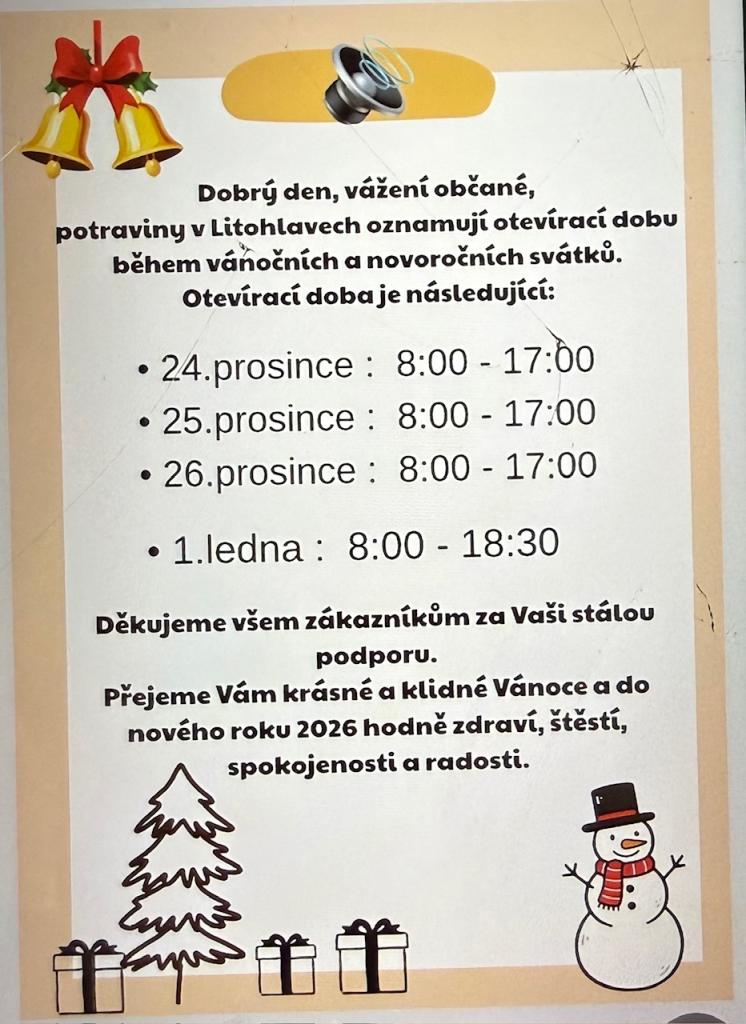 Potraviny v Litohlavech oznamují otevírací dobu během vánočních a novoročních svátků. Na Štědrý den 24. prosince budou otevřeny od 8:00 do 17:00, na první svátek vánoční 25. prosince od 8:00 do 17:00 a na druhý svátek vánoční 26. prosince opět od 8:00 do 17:00. Nový rok přivítají 1. ledna s otevírací dobou od 8:00 do 18:30. Děkujeme všem zákazníkům za Vaši stálou podporu a přejeme krásné a klidné Vánoce, stejně jako hodně zdraví a štěstí do nového roku 2026.