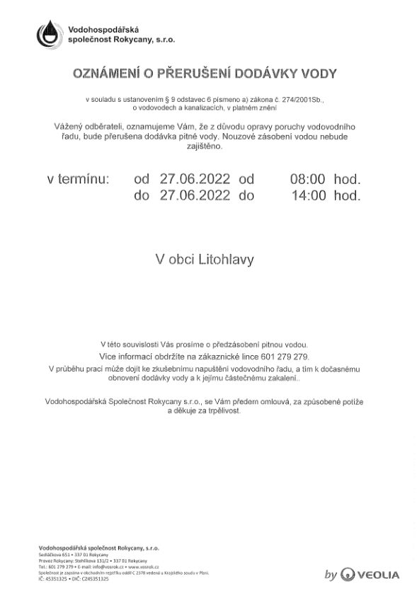 Oznámení o přerušení dodávky vody 27.6.2022 od 8:00 do 14:00 hodin v celé obci Litohlavy.