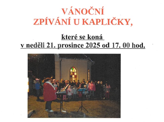 Zveme všechny občany na tradiční Vánoční zpívání u kapličky, které proběhne v neděli 21. prosince 2025 od 17.00 hodin. Těšit se můžete na krásné vánoční koledy a příjemnou atmosféru. Již od 16.30 hodin bude otevřeno naše mini vánoční tržiště, kde si můžete zakoupit upomínkové a vánoční předměty. K dispozici bude také pravý vánoční svařák, který vás zahřeje během chladného večera. Přijďte strávit příjemný čas s rodinou a přáteli.