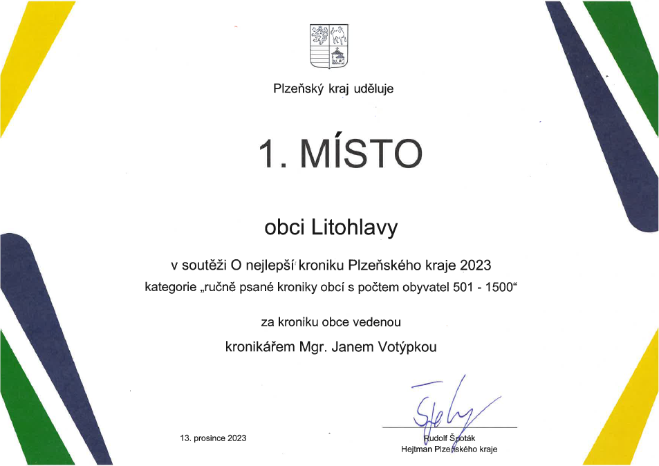 Obec Litohlavy se zúčastnila soutěže O nejlepší kroniku Plzeňského kraje 2023, kde se umístila na prvním místě v kategorii „ručně psané kroniky obcí s počtem obyvatel 501–1500“. Velké poděkování patří panu Mgr. Janovi Votýpkovi za vedení obecní kroniky.