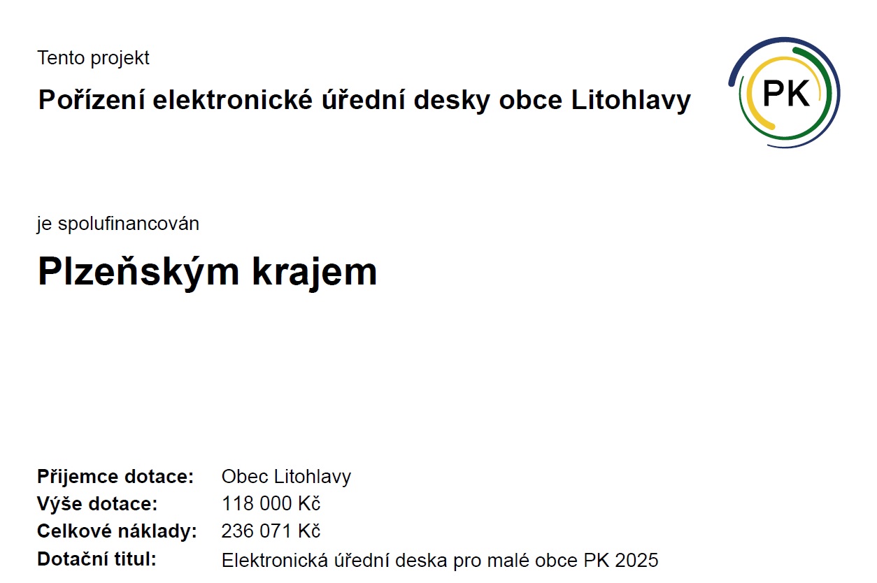 Obec Litohlavy získala dotaci od Plzeňského kraje na pořízení elektronické úřední desky. Výše dotace činí 118 000 Kč, přičemž celkové náklady projektu dosahují 236 071 Kč. Tento projekt je realizován v rámci dotačního titulu 'Elektronická úřední deska pro malé obce PK 2025'. Cílem je modernizace a zefektivnění komunikace s občany prostřednictvím elektronických služeb.
